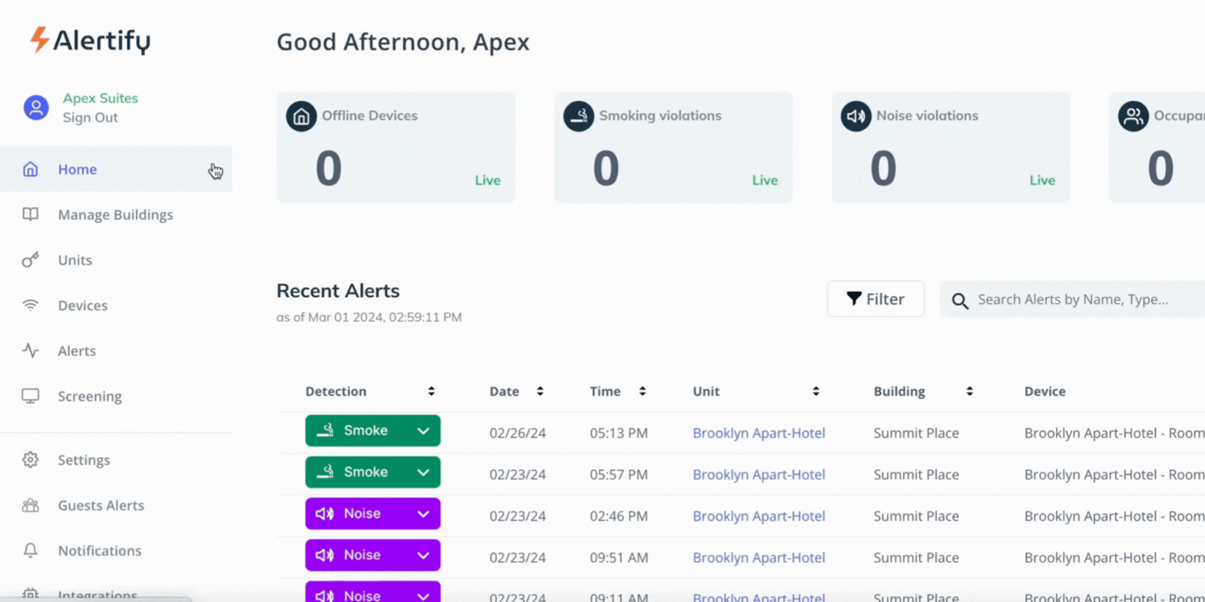 Yes. When connected with a property management system, Alertify can notify your guests that smoke has been detected in their unit and to please stop smoking immediately. Guest Alerts are customizable on the dashboard, and hosts can set-up follow up messages and decide what those messages should be.