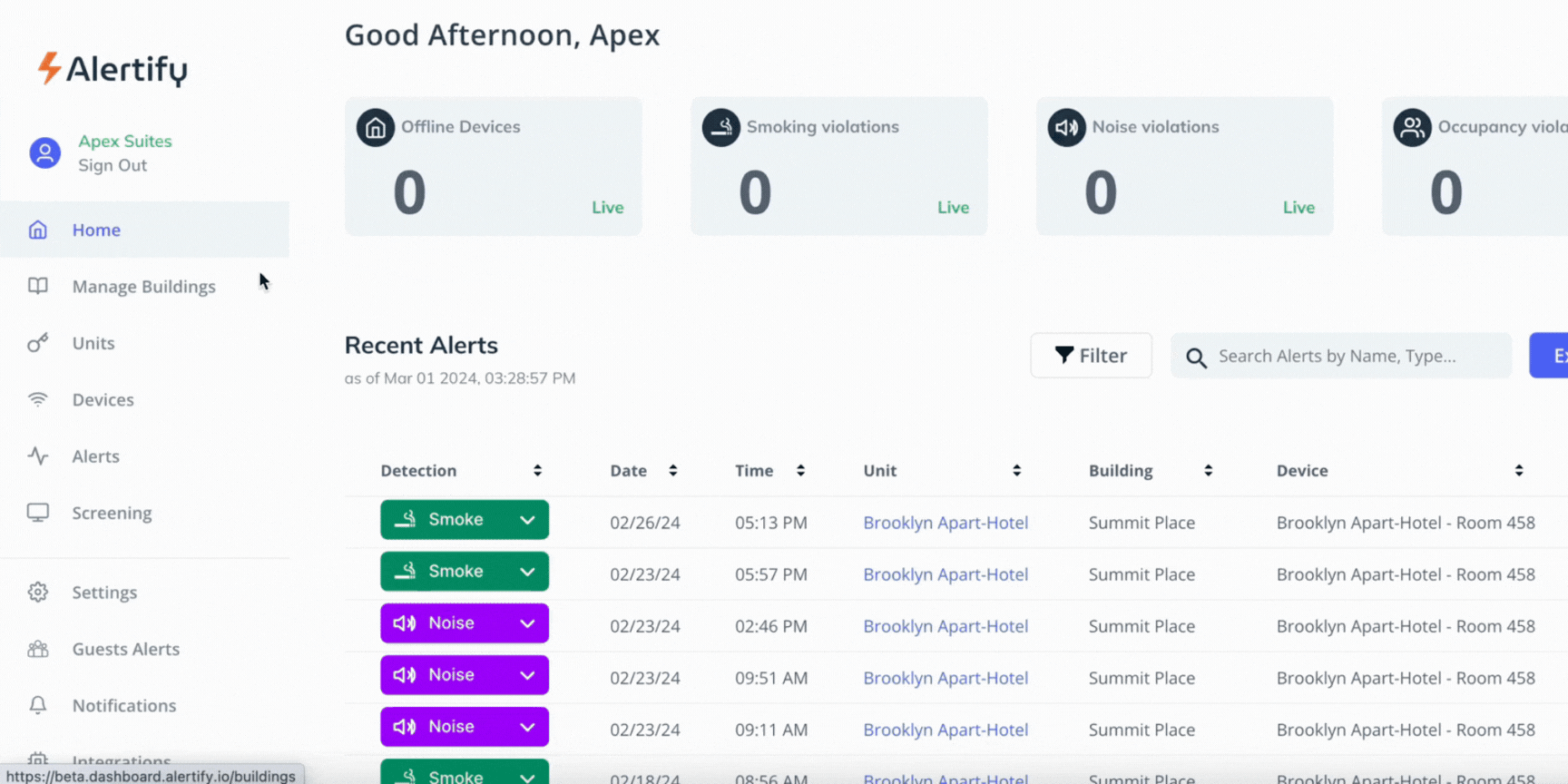 Alertify monitors loud noise that has been going on for an extended period. Noise monitoring settings are customizable from how sensitive you want the device to be to how many notifications you’d like to receive and if you’d only like noise monitoring during certain times of the day.