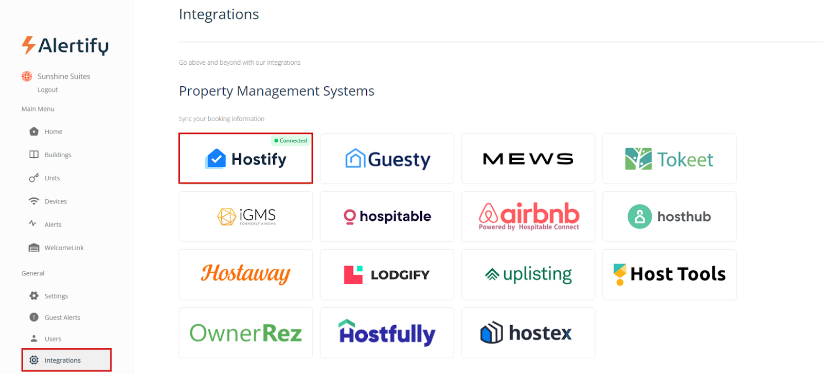 6. Once this is done, head to ‘Integrations’ on the left menu bar and Select the PMS you are connected to.