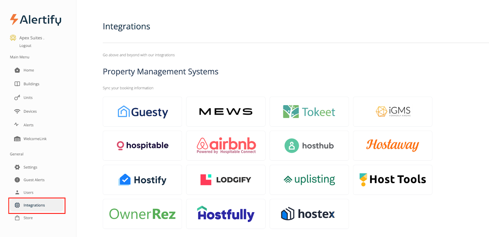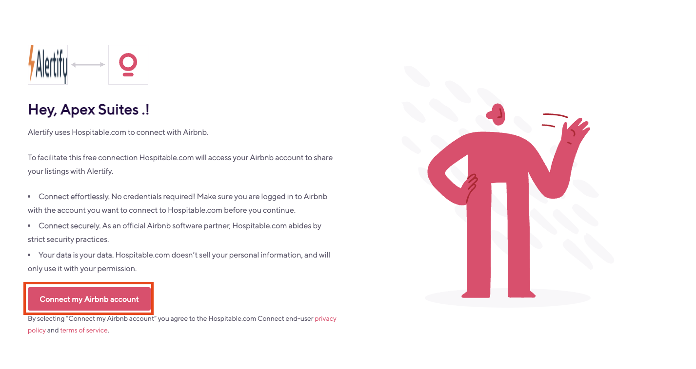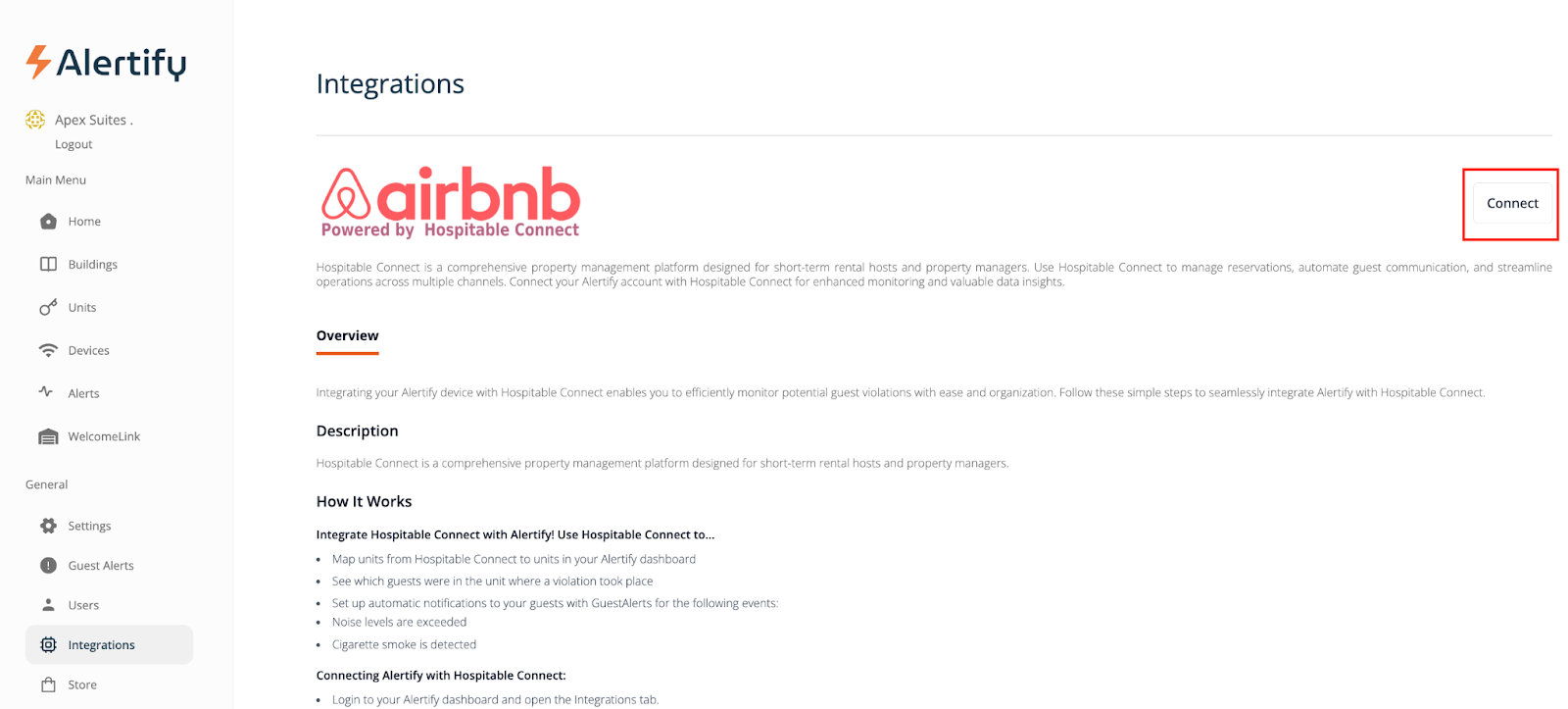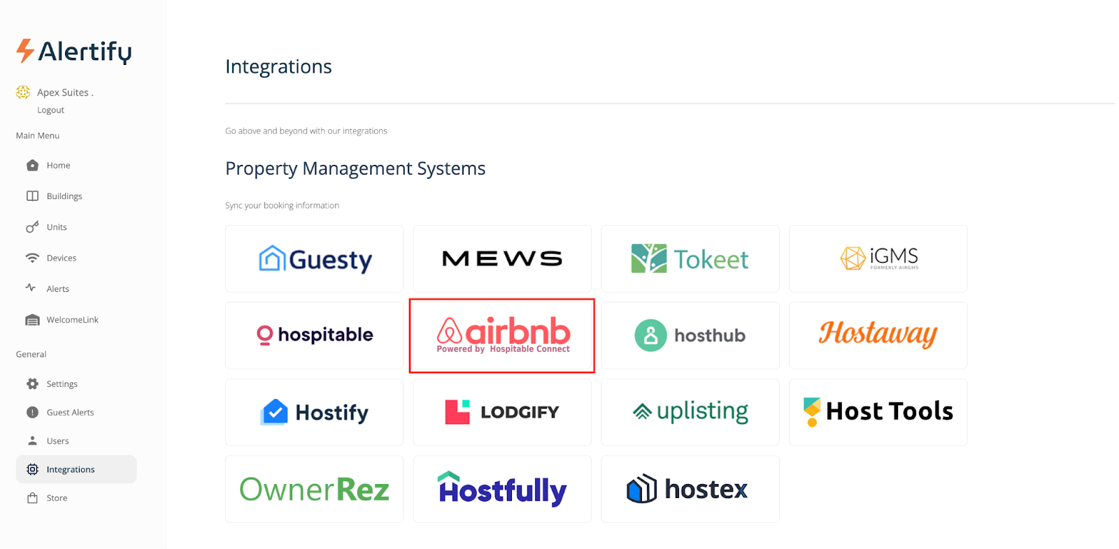 If you are not using property management software, you can connect your Airbnb account directly to Alertify for free using Airbnb powered by Hospitable Connect. This integration allows you to sync your Airbnb units and guest information directly into your Alertify dashboard.