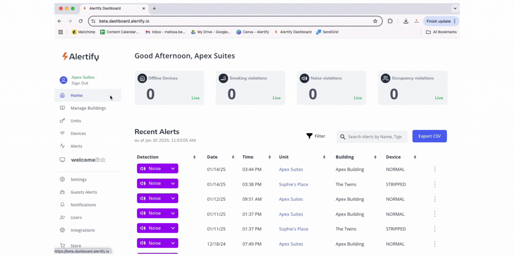 Integrate Hospitable with Alertify so you know which guests are in your units, set Alertify to automatically message your guests if indoor smoking or excessive noise is detected, and have key guest information included on Alertify’s after-incident reports.