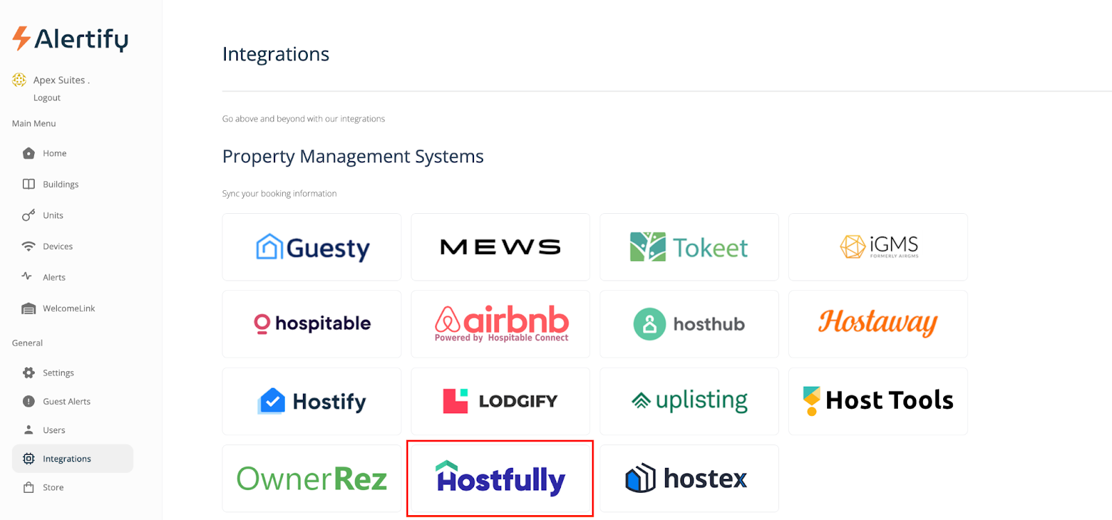 Connecting Hostfully to your Alertify dashboard enables automatic syncing between your property data and your smart monitoring setup. With this integration, you can easily assign devices to the correct properties and track which guests are staying in your units - ensuring your Alertify alerts and reports are accurate and actionable.