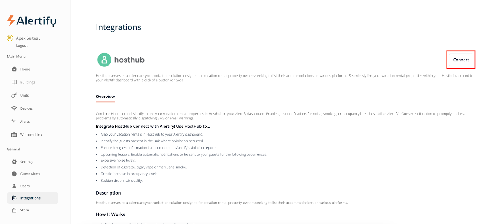 Integrate Hosthub with Alertify and notify guests when noise, smoking or guest occupancy violations occur. With Alertify’s GuestAlert feature, noise issues are dealt with quickly by sending automated warnings via SMS.