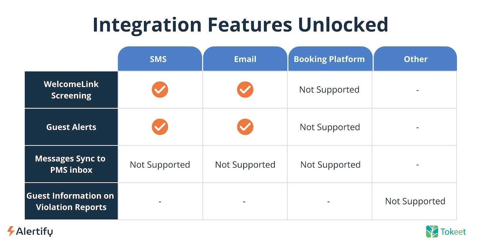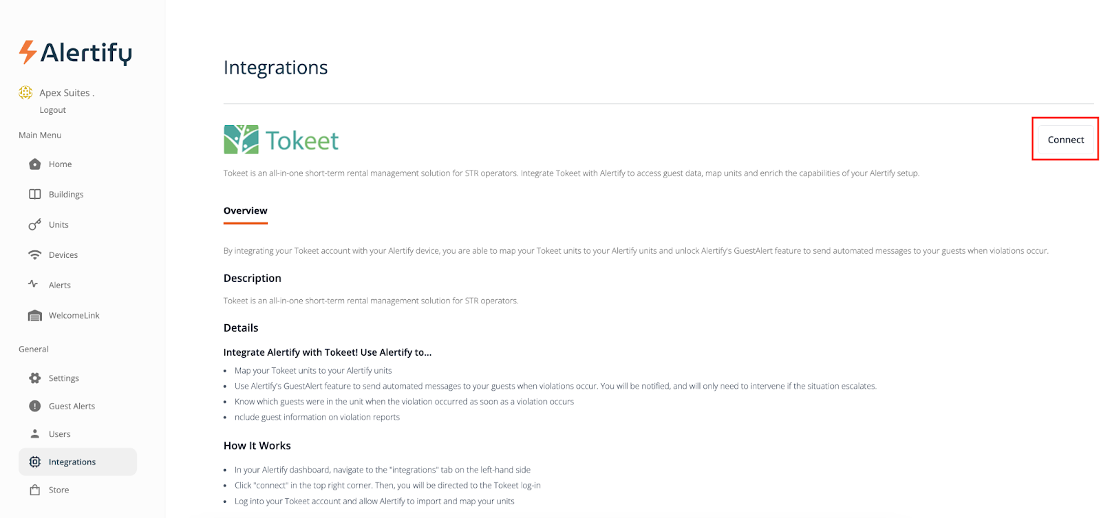 Integrating Alertify with Tokeet will ensure that your properties are protected, all while making sure your guests' are comfortable. Intervene before noise disturbances, indoor smoking and unauthorized parties turn into costly damages, know which guest is responsible for any disturbances and set up automated Guest Alerts to promptly notify guests when violations occur.