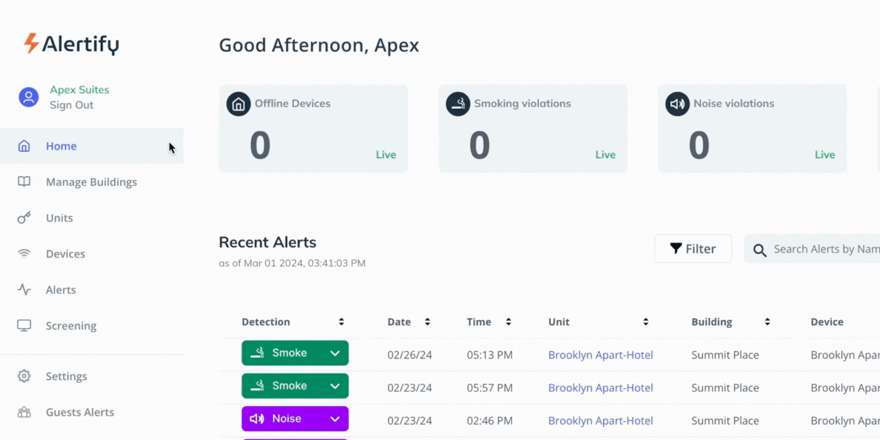 Alertify’s cigarette smoke monitoring is always on and continuously monitors the air for the presence of cigarette smoke. To turn on the cigarette smoke monitoring: 1. On your Alertify dashboard, navigate to Devices on the left menu, click on the ...
