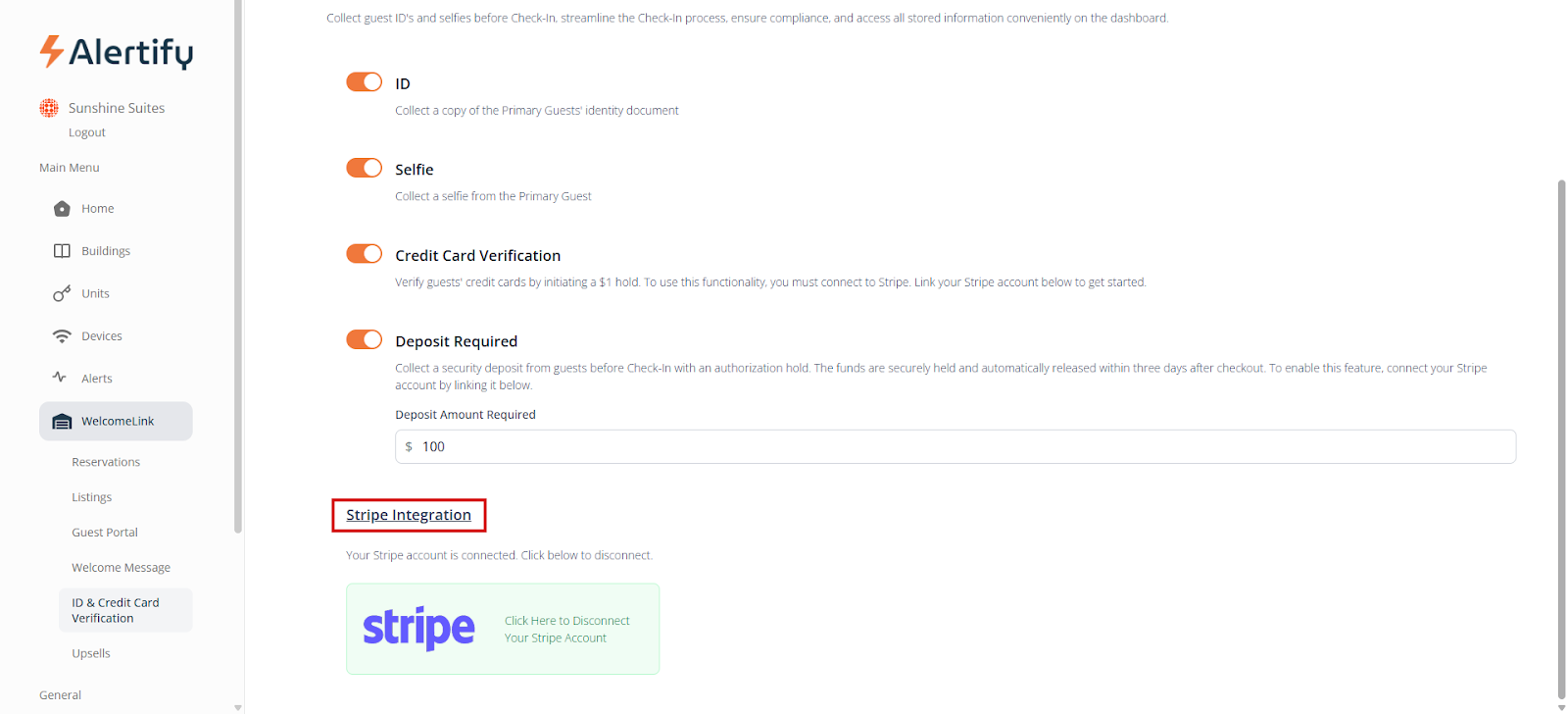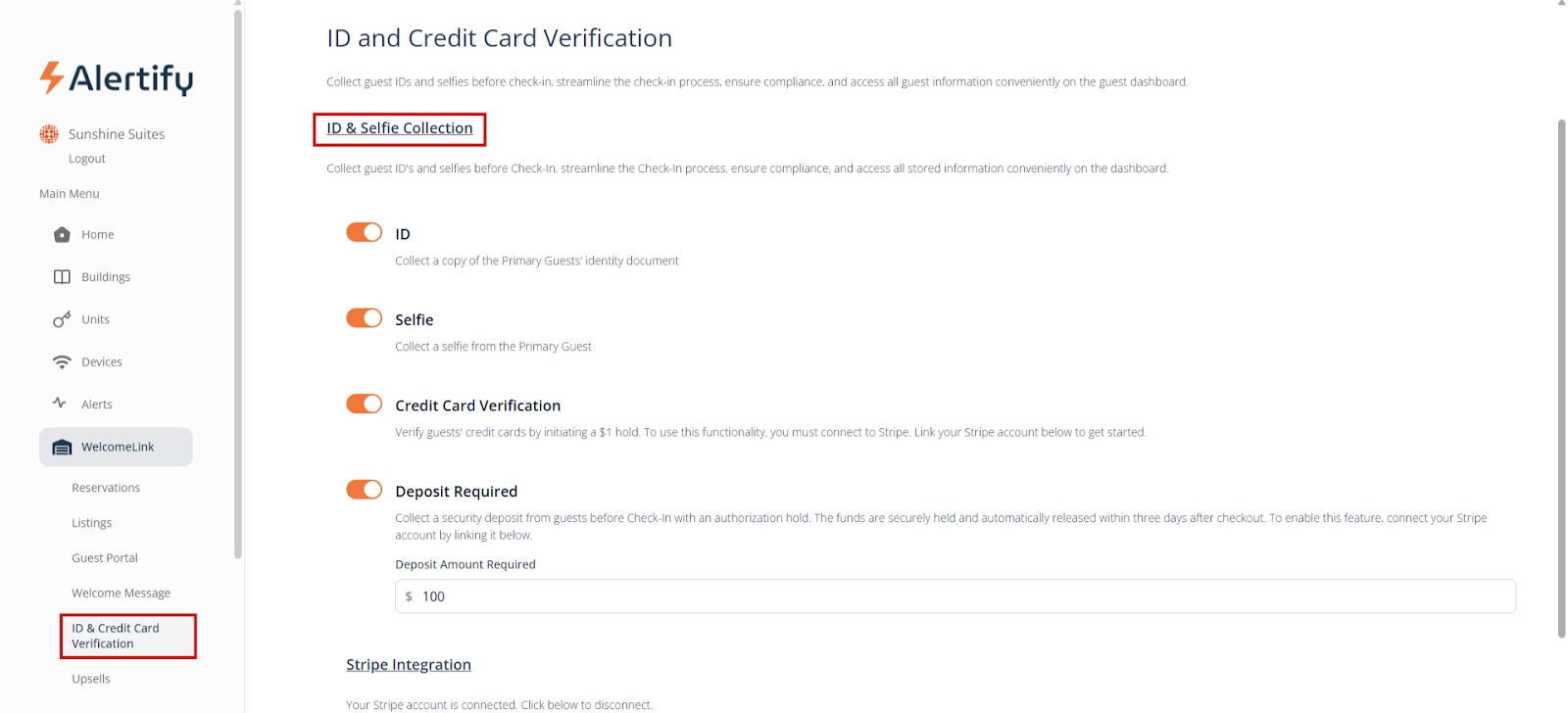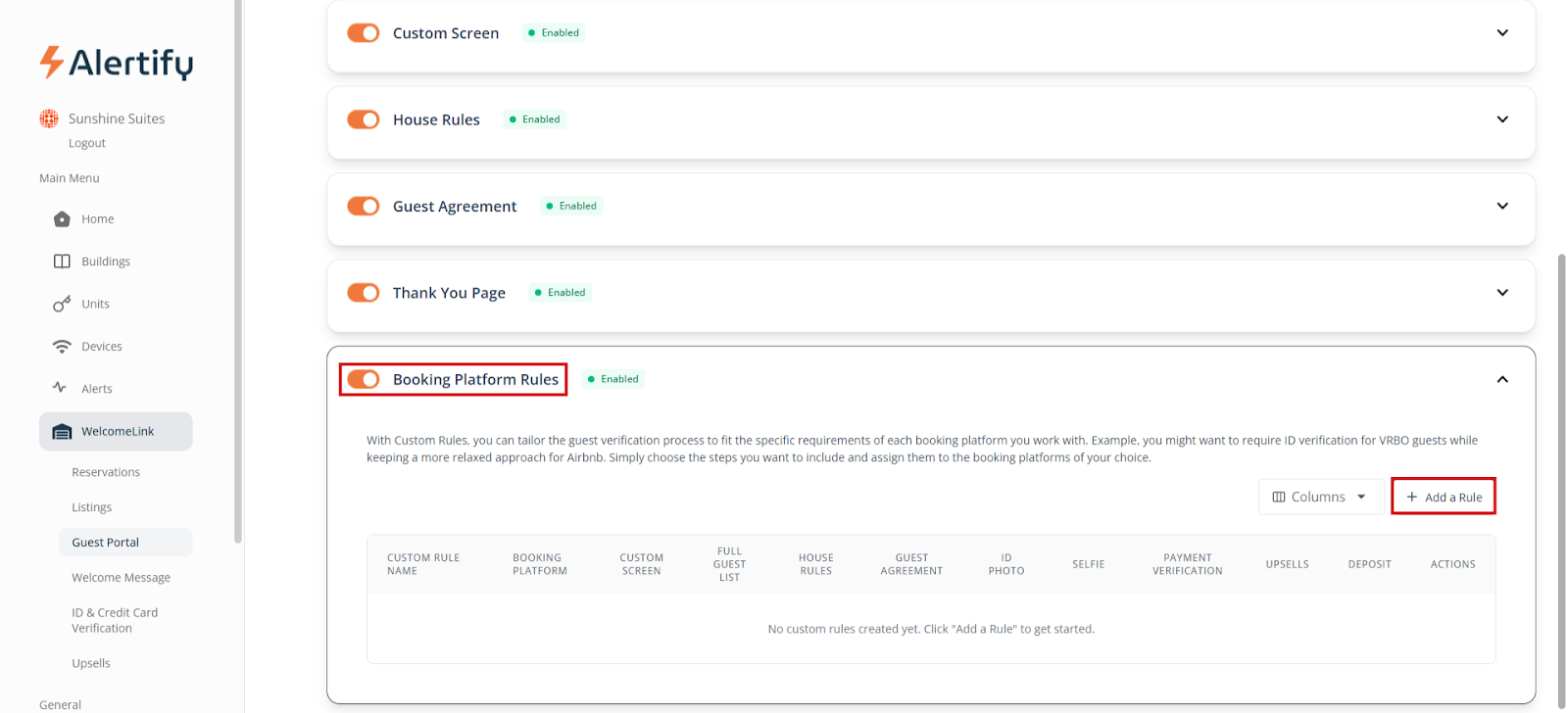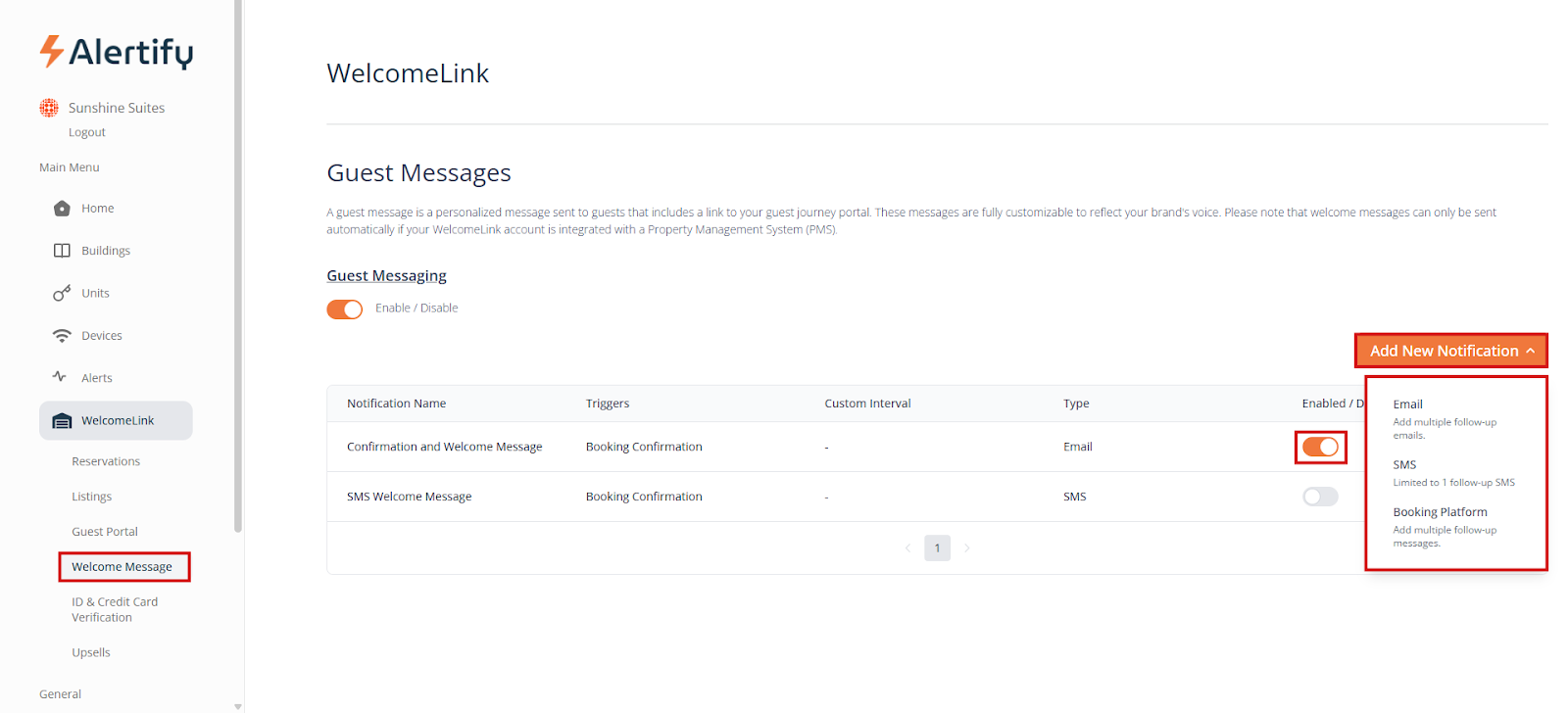 WelcomeLink can be used manually by creating a new guest to send the screening link to. To activate automatic Welcome Messages, you will need to be integrated with a PMS on your Alertify dashboard and have your units linked. Once you have done that, you can go to “WelcomeLink” and then “Listings” and activate all the listings you want guest verification for.