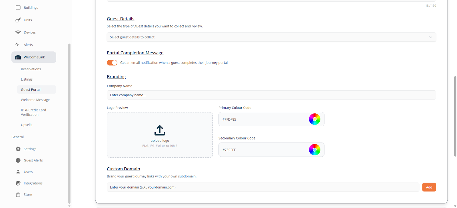 Here you will need to update your preferences for what you’d like to collect from your guests prior to confirming their booking. Additionally, you will also be able to customize your branding including a company logo and colors, and a custom domain.